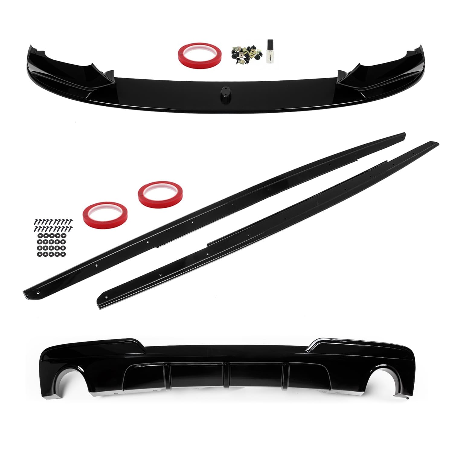 - Included: front bumper spoiler - lip, side skirt extensions, diffuser, fasteners;
